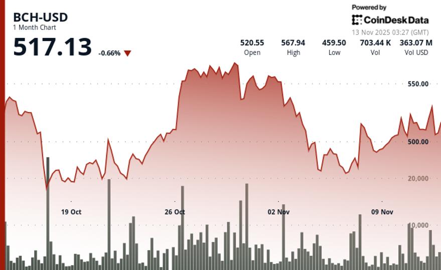 According to CoinDesk Research’s technical analysis data model, BCH$524.04 posted solid gains during Wednesday’s session, advancing 1.9% from $508.32 to $518.01 amid heightened volatility across crypto markets. The move established clear bullish momentum within a $32.78 trading range, representing 6.4% intraday volatility as BCH outperformed while most altcoins stumbled at key resistance zones.