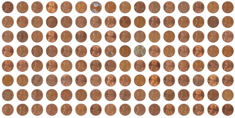 The project starts, like most of Chang’s work, from a condition that many people vaguely know about but rarely think through with any care or precision. Chang limited his collection specifically to cents minted before 1982, the year when the U.S. Mint changed the composition of the penny to reduce costs. Before 1982, pennies were made primarily of copper; after that date, they became copper-plated zinc. This seemingly minor detail has real consequences: pennies from the earlier period can, under certain market conditions, exceed their face value when considered purely as raw material. The copper content might be worth more than one cent. This creates an odd situation where the State continues to define each coin as being worth exactly one cent (and makes melting them for their metal content illegal), while the material reality of the object suggests a different value entirely. Chang doesn’t treat this as a paradox to resolve or a problem to solve. He treats it as a given, as one of the structural conditions that makes the work possible and interesting.